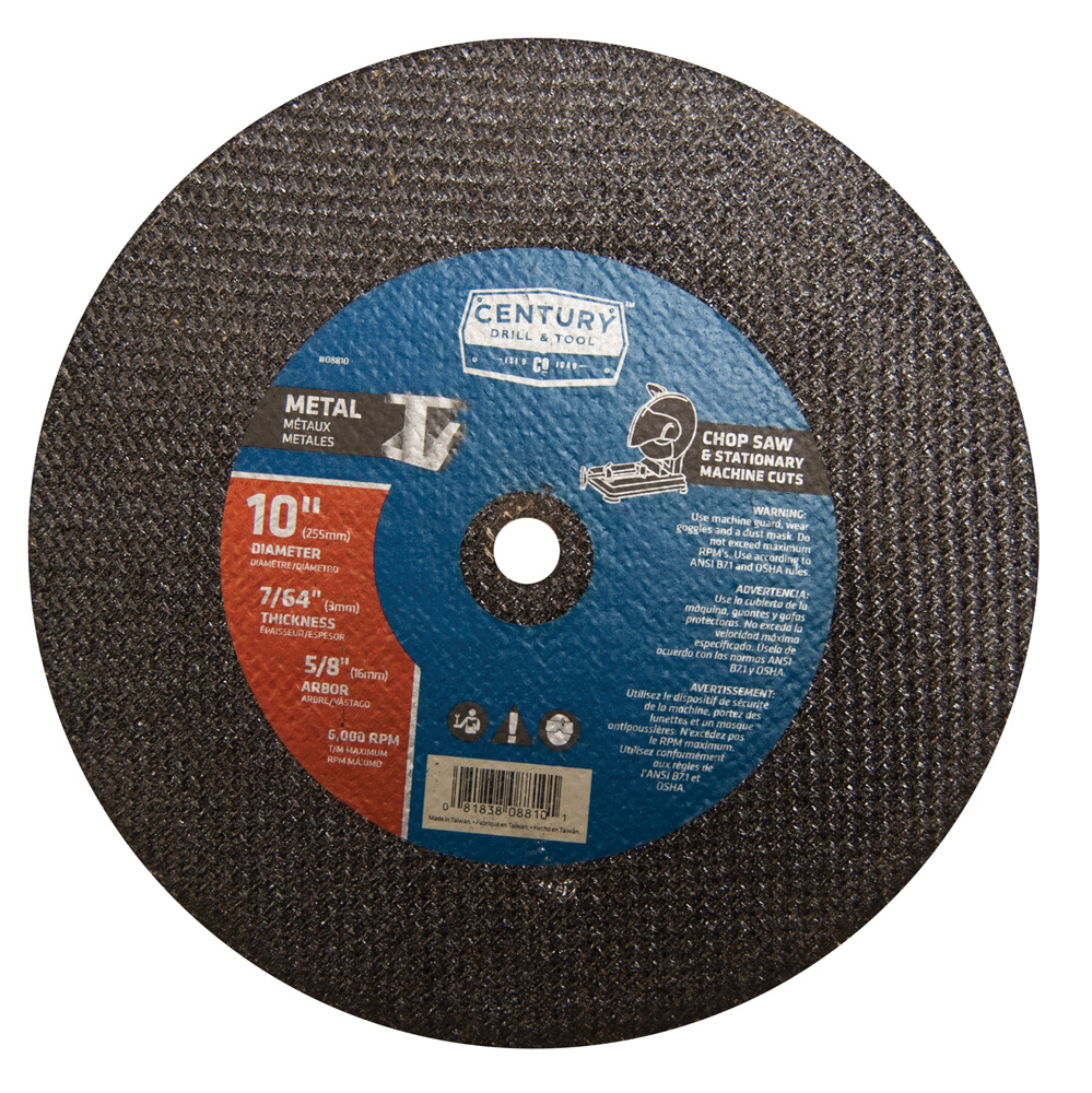 Century Drill & ToolType 1A (Metal) For Chop Saws & Stationary Machine Cut-Off WheelsMetal Cutting10 in5/8 in6,000 Safe Max SpeedA24R7/64 in1 $10.99 Add to cart