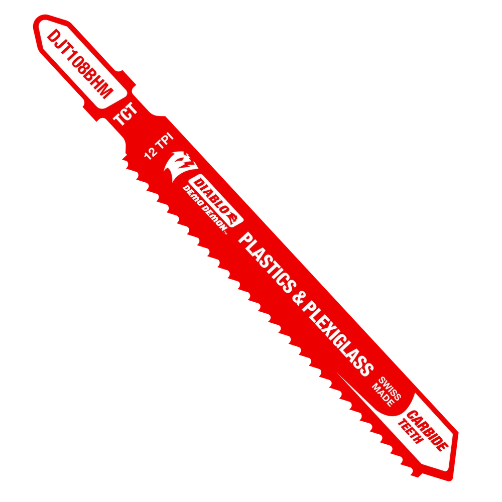 Diablo Tools Carbide Teeth Jigsaw BladesThank you for shopping with us! Diablo’s carbide teeth jigsaw blades deliver extreme durability and superior cutting life in a wide range of materials such as wood, metal, and plastics. High-performance carbide teeth provide an unmatched up to 50X longer cutting life versus standard jigsaw blades. The optimized blade design and Perma-SHIELD® non-stick coating reduces heat and pitch buildup for fast and effortless cuts. T-shank design fits all combo and most U-shank cordless and corded jigsaws. High performance carbide for greater durability and up to 50X longer life versus standard jig saw blades