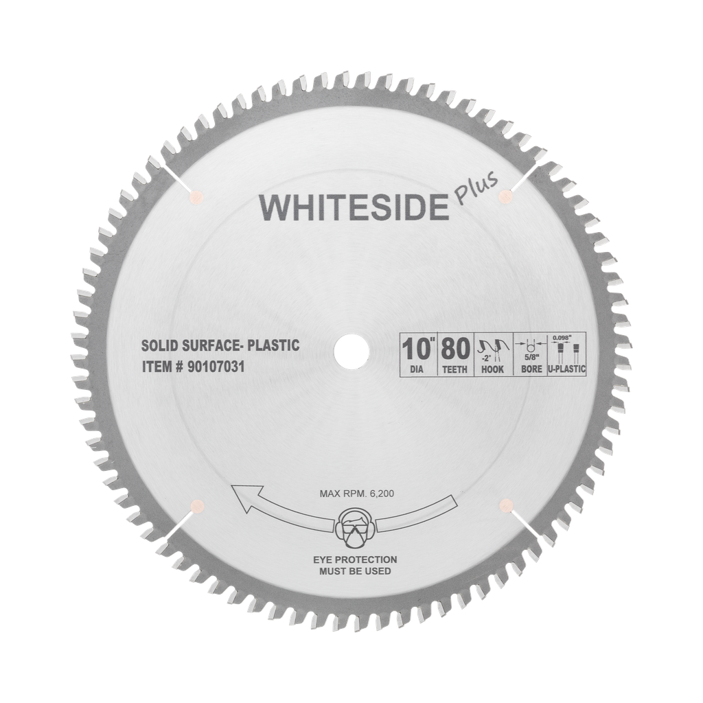 Whiteside Plus Plastic Cutting BladesThank you for shopping with us! The special tooth grind on these blades is compatible for cutting plexiglass, solid surface, acrylics, polycarbonates, ABS, and PVC. This tooth grind, along with the fine-tooth configuration, produces a superior finish in many plastics. |
