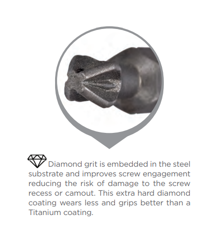Diamond-Tipped: Diamond grit is embedded in the steel substrate and improves screw engagement, reducing the risk of damage to the screw recess or camout. This extra hard diamond coating wears less and grips better than a Titanium coating.