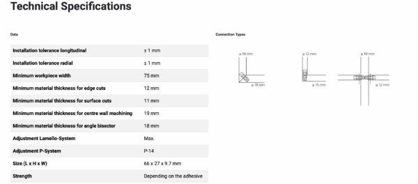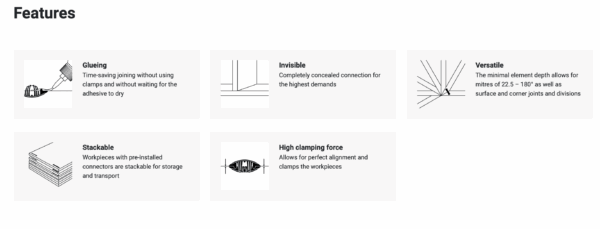 The Tenso P-14 consists of a connector half with powerful tension springs. These anchor in the counterpart and generate high pressure on the joint. This high clamping force allows the user to glue furniture parts or wood composites without clamps, protectors, tape, or presses. The Tenso presses the joints together at the correct angle, always perpendicular to the cutting angle of the two workpieces.