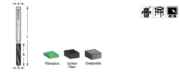These tools offer outstanding finishes in the most abrasive of glass fiber or CFRP applications. Combining a downcut spiral with ultra abrasion-resistant embedded diamonds. Excellent for superb top finishes and outstanding performance. For use on routers and machining centers with or without CNC systems. Must secure workpiece.
