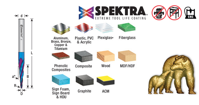 Specially designed for 2D and 3D CNC profiling and carving in plastic aluminum & wood with machines such as " i-Carver," CNC Shark®, ShopBot®, Datron & Carvewright™. The high-shear ball nose tips cut smooth 2D and 3D contours with reduced stepping, while the proprietary Spektra™ coating (applied by the physical vapor deposition coating process) provides high resistance to wear, sharper cutting edges, extended tool life, and less friction & heat buildup. Tools are manufactured with high balance that allows them to run up to 60,000 RPMs. Adjust your chip load and feed rate accordingly.