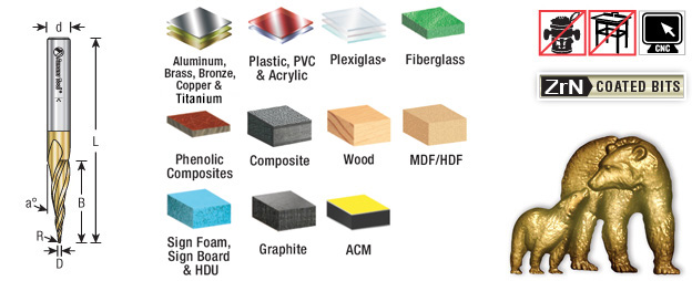 Specially designed for 2D and 3D CNC profiling and carving in plastic, aluminum, and wood with machines such as " i-Carver," CNC Shark®, ShopBot®, Datron & Carvewright™. The high-shear ball nose tips cut smooth 2D and 3D contours with reduced stepping, while the proprietary ZrN coating (applied by the physical vapor deposition coating process) provides high resistance to wear, sharper cutting edges, extended tool life, and less friction & heat buildup.