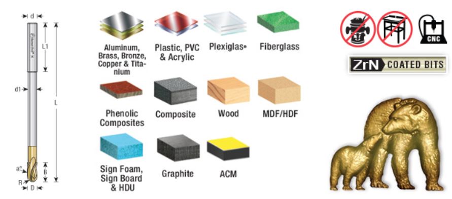 Specially designed for 2D and 3D CNC profiling and carving in plastic, aluminum & wood with CNC machines. The high-shear ball nose tips cut smooth 2D and 3D contours with reduced stepping while the proprietary ZrN coating (applied by the physical vapor deposition coating process) provides high resistance to wear, sharper cutting edges, extended tool life, and less friction and heat buildup. Some of Amana Tool carving tools, as you can appreciate, have a very small diameter therefore any material chip loads need to reflect that small size. It can however withstand RPM’s up to 60,000 RPMs. A directed air-blast to keep chips away along with cooling the tool and workpiece are always welcome. Tools are manufactured with high balance that allows them to run up to 60,000 RPMs. Adjust your chip load and feed rate accordingly.