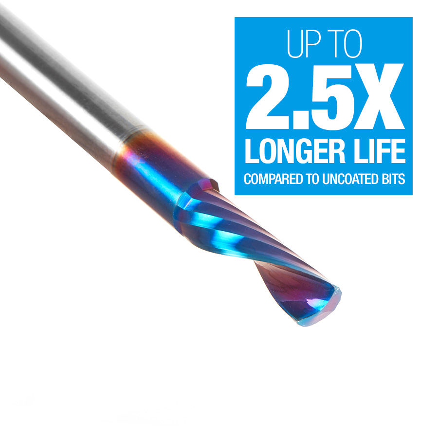 Our Spektra™ bits feature a nACo® nanocomposite coating with an extreme nanohardness and heat resistance. With a brilliant distinctively-tinted coloring nACo provides additional improvements in four critical aspects of router tooling.
