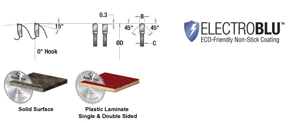 This blade is designed for cutting plastic laminate, Plexiglas®, and solid surface materials such as Dupont Corian®, Wilsonart®, Gibraltar®, and Fountainhead®. The triple-chip grind is especially configured to leave a swirl-free cut in solid surface materials. Thick, stable plate reduces vibration that degrades the cut and shortens tool life. The blade is suitable for a variety of saw configurations. The 0° hook angle virtually eliminates self-feeding when used with a radial arm saw.