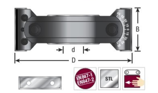 Cutterhead bodies available in hard wearing aluminum or steel, complete with tungsten carbide knives. Suitable for producing chamfer cuts at various angles in softwood, hardwood, and man-made boards on a spindle molder. Cutting angle can be adjusted in 7.5° increments by using notched scale. Fine adjustment of 1° is also possible.