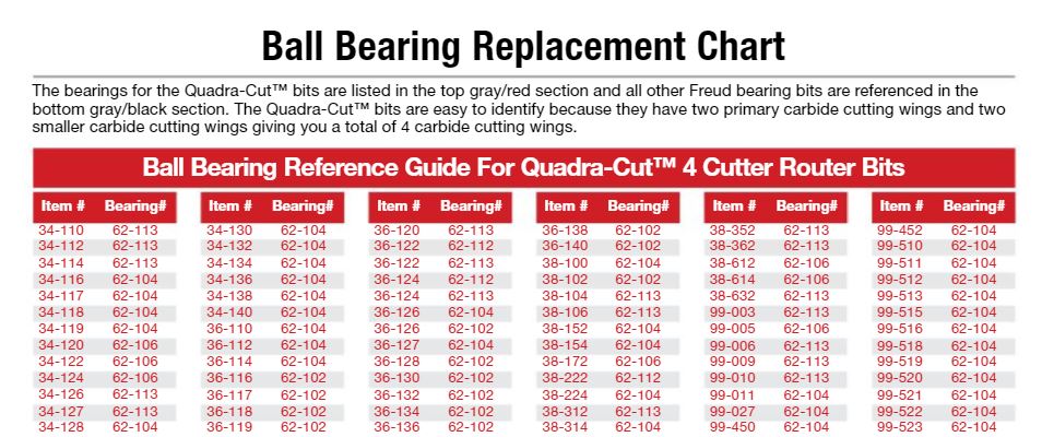 Freud router bits feature superior quality ball bearings. Lubricated with a high temperature lubricant to withstand the stresses of turning at 22,000 RPM's. Shielded to keep out the unwanted wood dust and chips that greatly reduce bearing life.