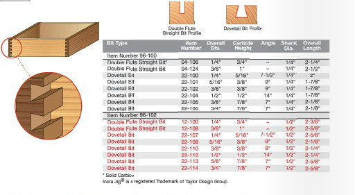 | Includes | 2 Double Flute Straight bits, 6 Dovetail bits in an attractive wooden storage box |