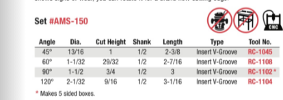 Item # AMS-150, Amana AMS Series 4-Pc 3D CNC Signmaking, Lettering & Engraving Insert Solid Carbide 45, 60, 90 & 120 Degree V-Groove Router Bit Collection, 1/2" Shank