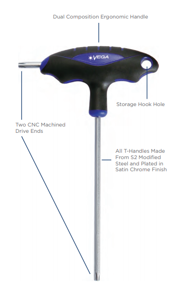 All T-Handles are made from S2 modified steel for industry leading performance and durability • T-Handles feature two drive ends for maximum versatility • All drive tips are CNC machined for precise fit in the fastener recess • Through-hardened for maximum durability • Ergonomic handles are molded on for a permanent bond