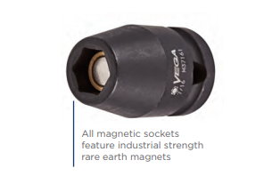 Made from S2 modified shock resistant steel for professional performance and durability. Rounded corners on hex and square opening for stress relief. High strength industrial magnet. Spring loaded magnet adjusts for variable depth applications.