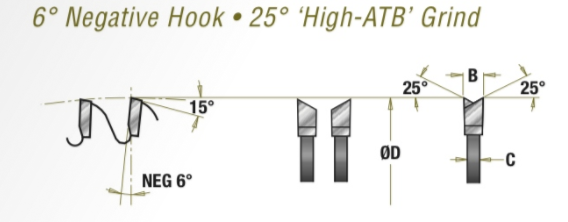 The special " High ATB" grind (with 25° bevels) slices cleanly through fragile surface coatings like melamine and laminate. Coupled with a thick, heavy-duty plate for added stability, this blade produces extremely smooth cuts. It is easily resharpened.