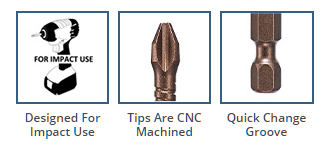 Made from S2 modified shock resistant steel for professional performance and durability. Patented spiral torsion zone absorbs impact and extends bit life. Proprietary precision CNC machined tips for excellent fit in fastener recess. Tested to outperform all leading brands in lifecycle and tip failure testing.